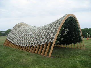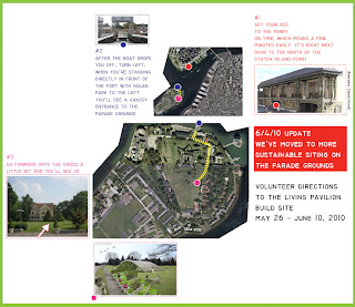 Figment has been an amazing supporter of this project. I'm waiting with anticipation to see this beautiful structure filled with arts programming and impromptu gathering come the debut of Figment 2010 on Friday--note the wealth of scheduled performances on the Pavilion Stage, from belly and ballroom dancing to improv musical comedy and interactive folktale theater. The participatory arts scene has been a great source of inspiration for me over the past few years, as has the architecture and design community. It means a lot that the we were able to merge the glorious social utopia of the glittering costumed free-for-all with a professional, measured, and intellectual view toward larger scale design thinking and experiments in sustainability. The ultimate test of our health as a society is how we fulfill ourselves as individuals in the context of shared space and resources. Participatory architecture has produced an icon to this belief that will literally grow into its own as plantings germinate and people, through use, imbue their own meanings.